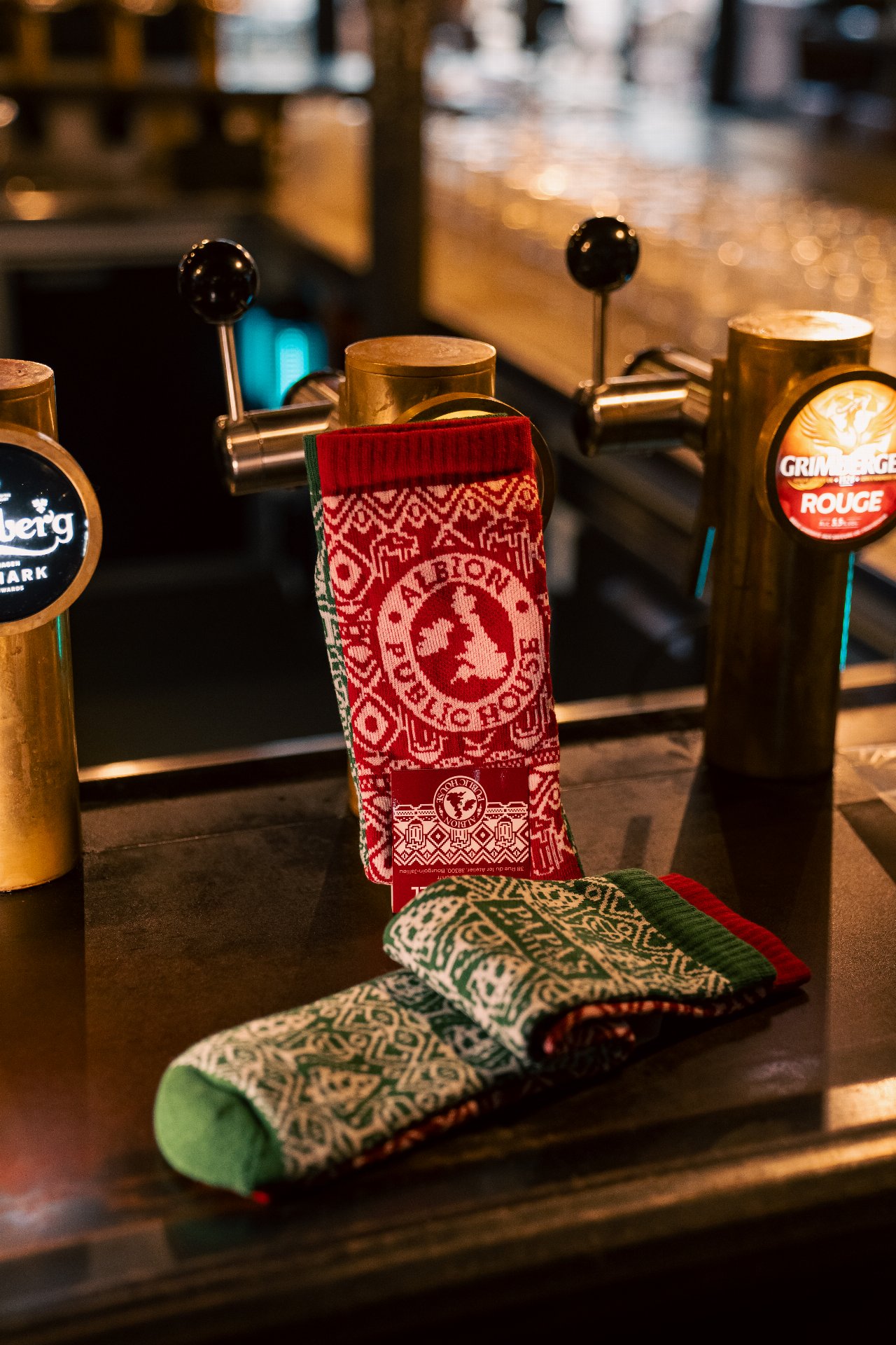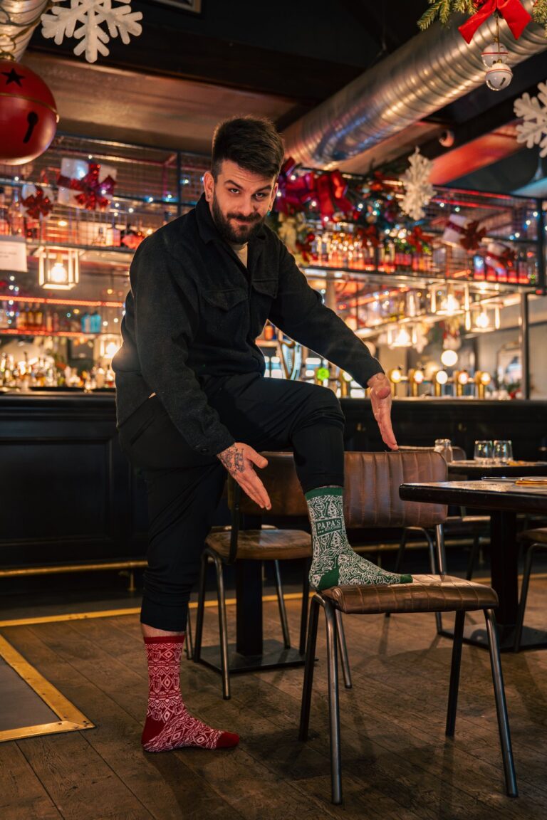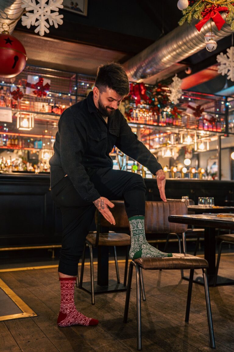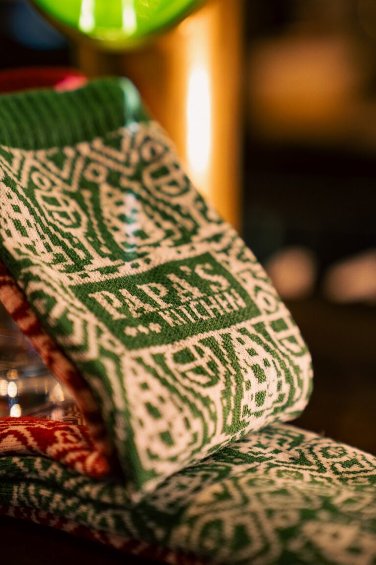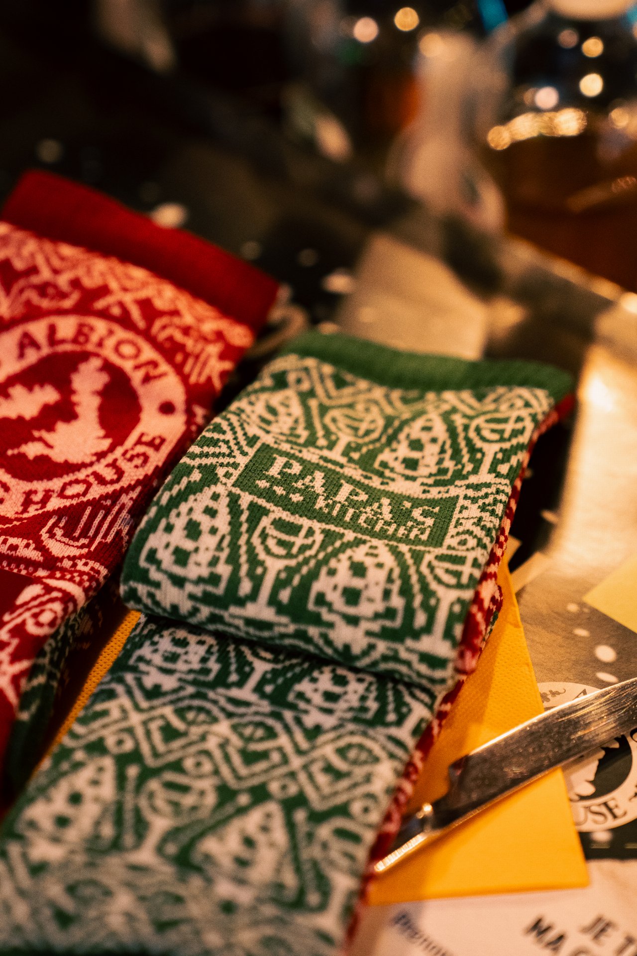 Plus sérieusement, on est partis sur un design de chaussettes de Noël très classique… sauf que si tu t’approches, tu repères plein de petits détails : des éléments emblématiques de chaque resto, glissés dans le motif.