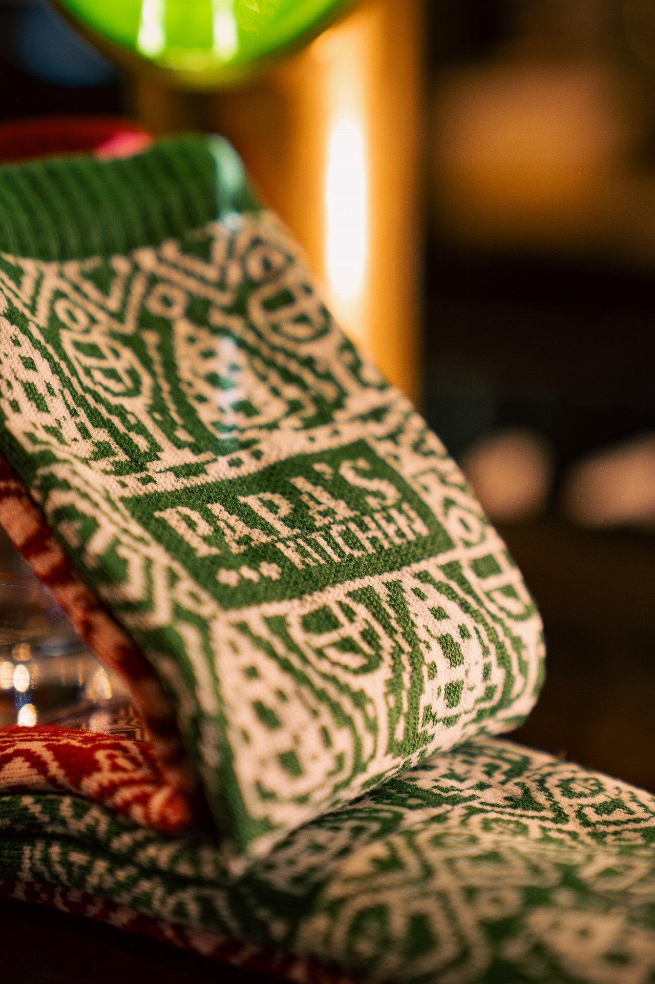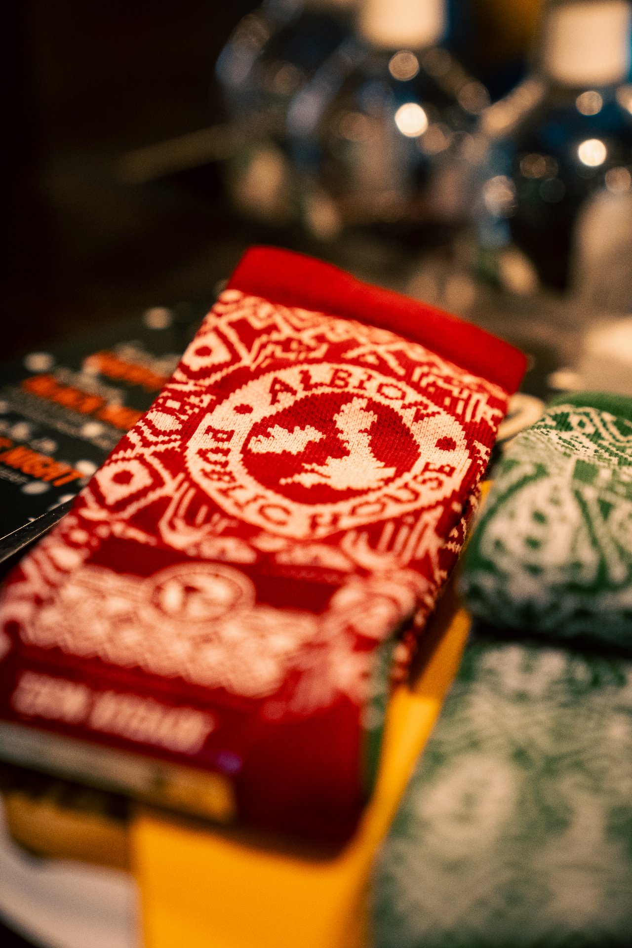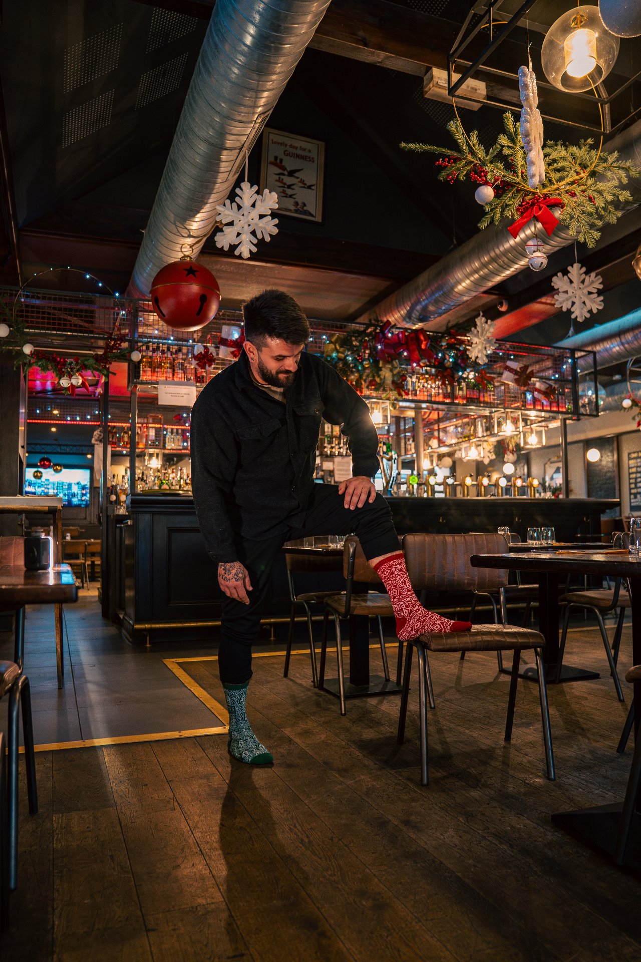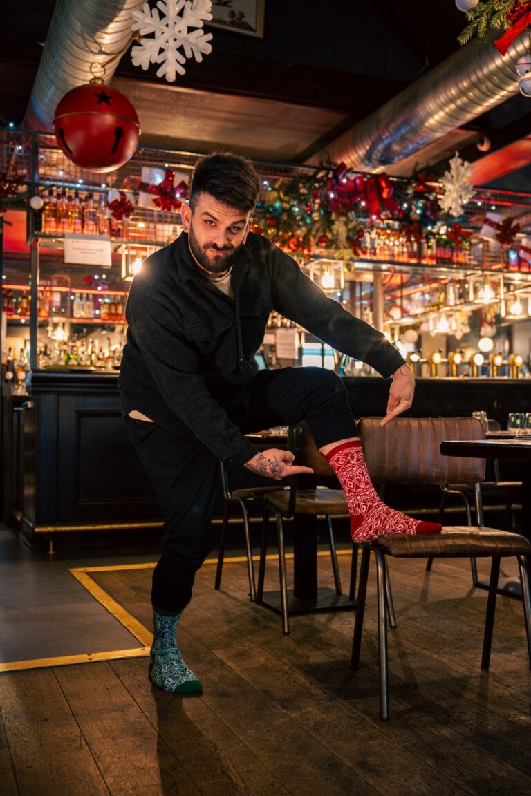 Plus sérieusement, on est partis sur un design de chaussettes de Noël très classique… sauf que si tu t’approches, tu repères plein de petits détails : des éléments emblématiques de chaque resto, glissés dans le motif.